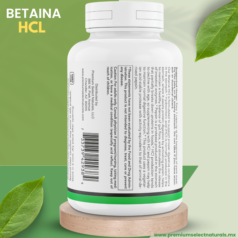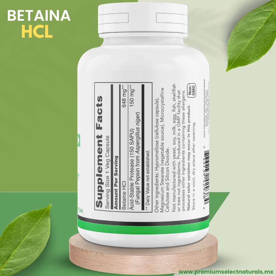 El ácido clorhídrico (HCl) normalmente se produce en el estómago. La pepsina es una proteasa producida en el estómago. La producción de HCl tiende a disminuir con la edad, por lo que la suplementación con HCl y pepsina puede ayudar a mantener una función digestiva normal.* Este producto utiliza una proteasa estable a los ácidos vegetariana con una actividad equivalente a la de la pepsina de origen animal. La variación de color natural puede ocurrir en este producto.