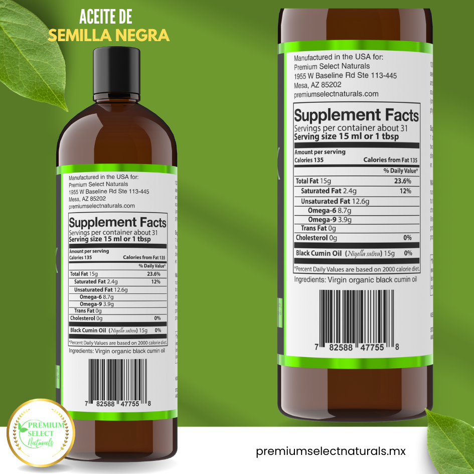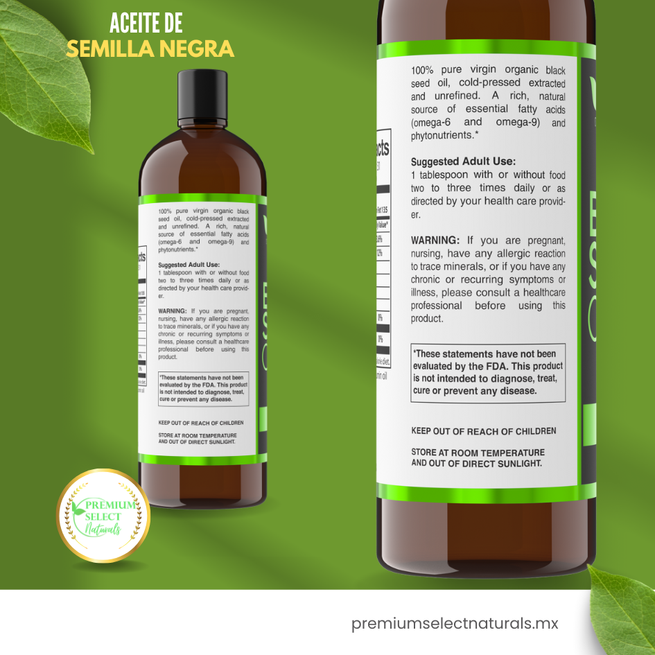 El aceite de semilla negra Premium Select Naturals se extrae por presión en frío de las semillas del Nigella sativa planta. Es orgánicamente aceite de comino negro virgen de origen. Una rica fuente natural de ácidos grasos esenciales (omega-6 y omega-9) y fitonutrientes.