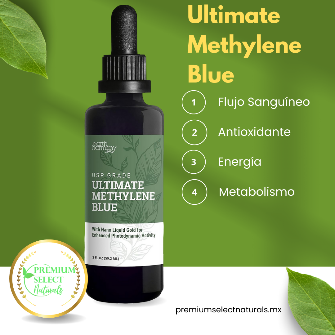 El azul de metileno Earth Harmony Ultimate está impregnado de nanooro líquido para mejorar su eficacia. Es 99,99 % de grado USP sin formaldehído. La glicerina vegetal ecológica está elaborada a partir de semillas de mostaza ecológica.
