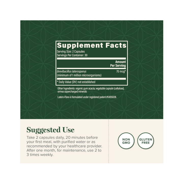Probiótico depurativo para el equilibrio de la cándida y los hongos. Con la cepa Brevibacillus laterosporus BOD, una forma única y potente de probiótico. Latero-Flora limpia los organismos nocivos como la cándida, a su vez que la repone con organismos beneficiosos. La fórmula está reforzada con goma de acacia orgánica, una fibra prebiótica natural que promueve el crecimiento de bacterias positivas.