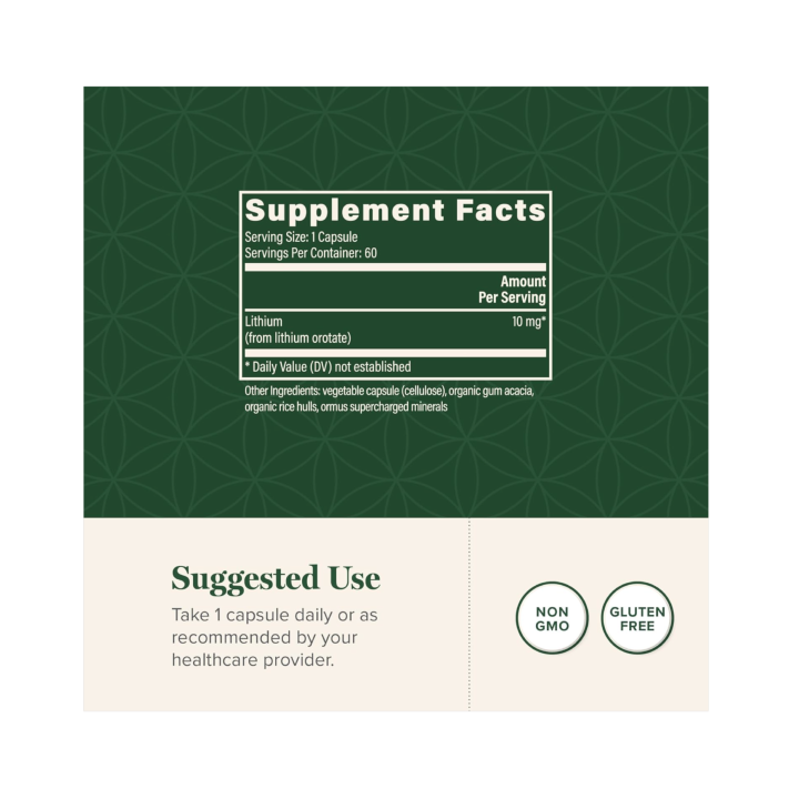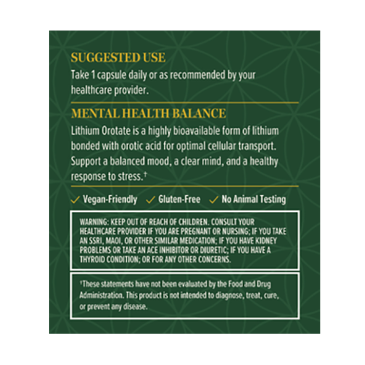 El Litio es un oligoelemento natural con una rica historia de uso terapéutico que puede desempeñar un papel importante en el apoyo a un estado de ánimo saludable y el bienestar mental. Una mente equilibrada y tranquila puede tener un impacto profundo en su bienestar general.